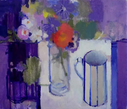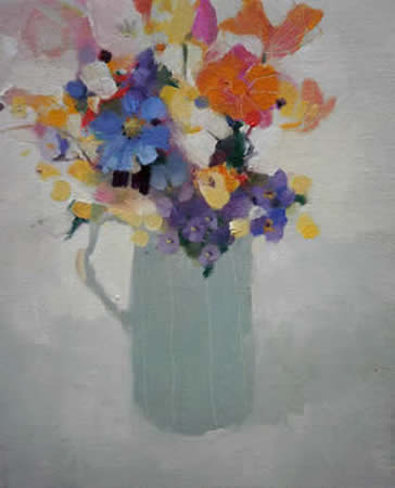 Pastels in a Striped Jug Oil on Linen